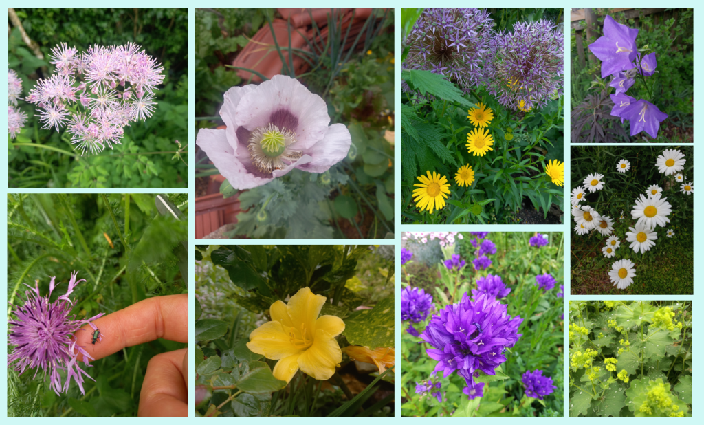Im Sommer geht es mit dem vielfältigen Blütenmeer weiter. Man entdeckt immer wieder neue Blumen und fragt sich wie die zu einem in den Garten gekommen sind. Dieses Jahr gab es zum ersten Mal einen Schlaf-Mohn (oben, 2. Bild von links). Die Knäuelglockenblume (unten, 2. Bild von rechts) versamt sich für meinen Geschmack fast schon zu arg, aber wenn man das geschäftige Treiben der Bienen um diese tolle Blume beobachtet, darf sie gerne bleiben. Auch wenn sich dadurch die ein oder andere Staude nicht voll entfalten kann.
