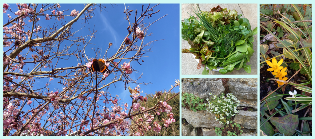 Im März bekommt die Sonne deutlich mehr Kraft und die ersten Schmetterlinge erfreuen sich an den wärmenden Sonnenstrahlen. Der ganze Garten erwacht wieder zu Leben. Schneeglöckchen und Krokusse blühen. Der Duftschneeball erfreut mit seinen rosa Blüten die ersten Bienen des Jahres. Vor allem im Gewächshaus legt das Blattgemüse los und wir können einen kunterbunten Gartensalat zubereiten.