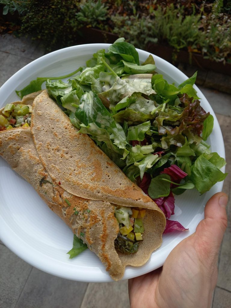 • Das Gemüsefach im Kühlschrank ist leer? Ein Gang durch den herbstlichen Garten und es gibt eine leckere Pfannkuchenfüllung aus Karotten, Asia-Salat, Winterheckenzwiebel und Stangensellerie, zusammen mit einem erntefrischen Salat.