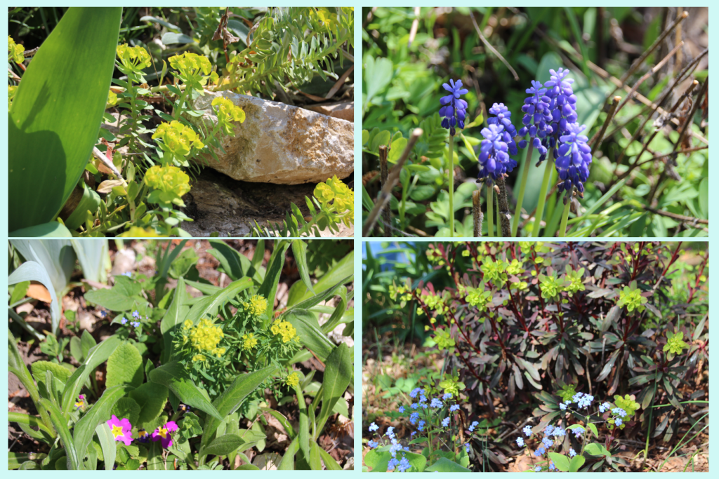 Die verschiedenen Wolfsmilchsorten lenken mit ihren tollen gelb-grünen Blüten gerade die Blicke auf sich. Ich liebe diesen Anblick, vor allem in Kombination mit den blauen Traubenhyazinthen.
