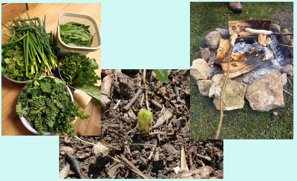 Im April ernte ich weiter fleißig Grünzeug. Der erste Grünspargel spitzt aus dem Boden und an Ostern gab es ein Osterfeuer mit Stockbrot. So ein Garten ist einfach toll!