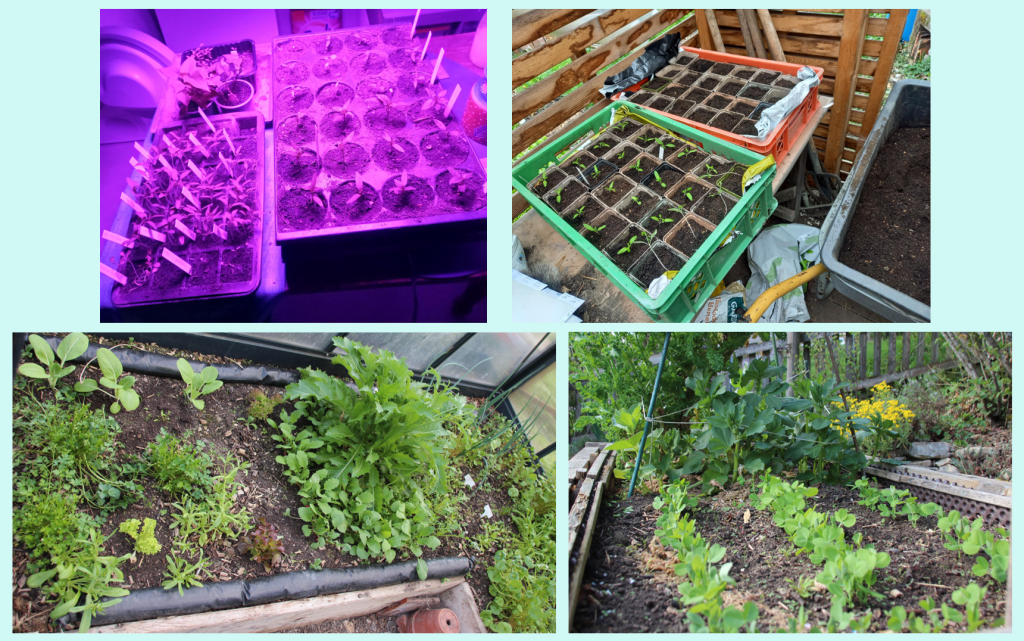 Ich habe bereits im Februar mit den ersten Aussaaten begonnen. Hier ist meine kleine Anzuchtstation im Keller sehr hilfreich. Paprika, Auberginen und Tomaten sind pikiert und warten darauf nach draußen zu können. U.a. Salate, Kohlrabi, Mangold, dicke Bohnen und Mairüben habe ich schon ins Beet gepflanzt, wobei auch dieses Frühjahr keine optimalen Wachstumsbedingungen bietet: Erst war es zu kalt, dann zwischendurch mal kurz fast schon zu warm, dann wieder kalt und jetzt zu trocken…mit dem Spinat habe ich dieses Jahr wohl wieder kein Glück, er geht zum Teil schon in Blüte.